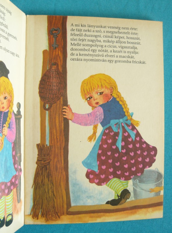 Kemény lapos mesekönyv, Mészáros Márta színes rajzaival, kissé kopottas borítóval.